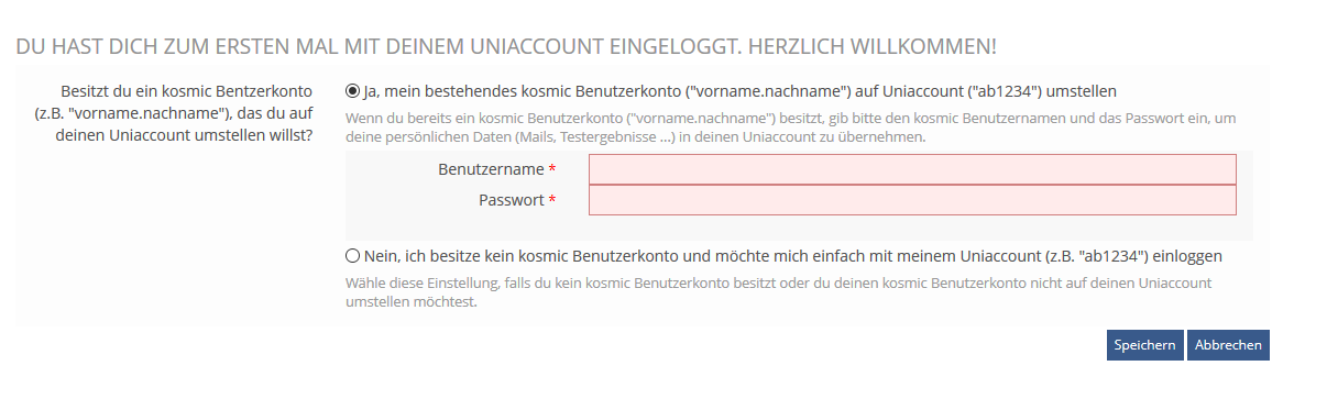 - Hinweis: Dieser Vorgang ist freiwillig und kann ausschließlich beim ersten Login mit Ihrem Uni-Account vollzogen werden (ein nachträgliches Zusammenlegen der Accounts ist nicht mehr möglich). Vorteil für Sie - alle Ihre bisherigen Lernergebnisse können in Ihren Uni-Account überführt werden.